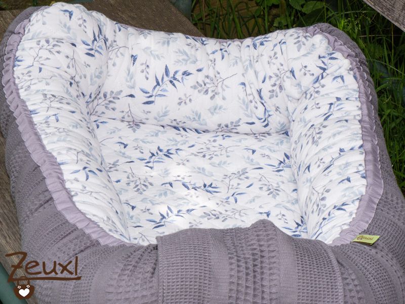 Ich entschied mich für das Schnittmuster von Sewsimple und dafür den Stoff für das Nest eher neutral zu wählen. Daher ist meine Wahl auf diesen blau gemusterten Musselinstepp von Stick & Style in Kombination mit Waffelpiqué von der Stofflounge gefallen. Eine harmonische Kombination, finde ich.