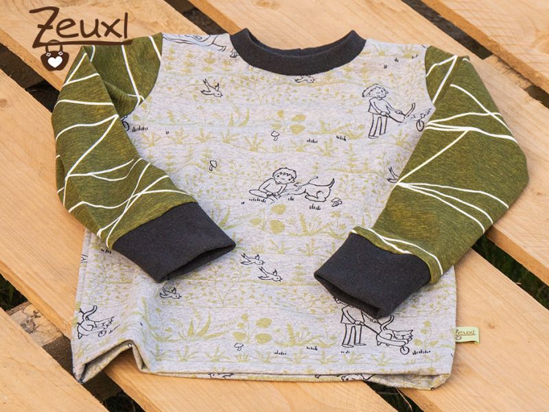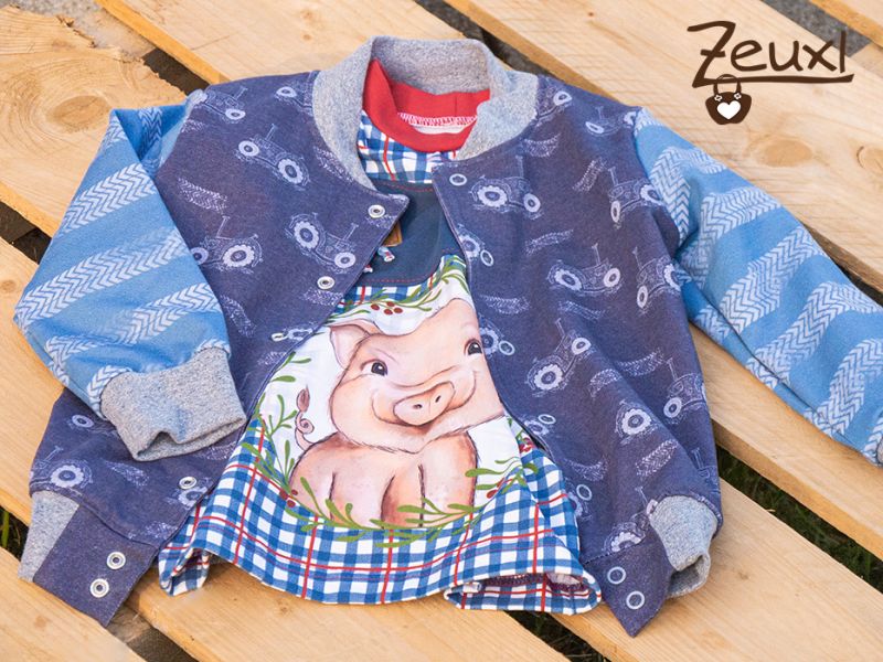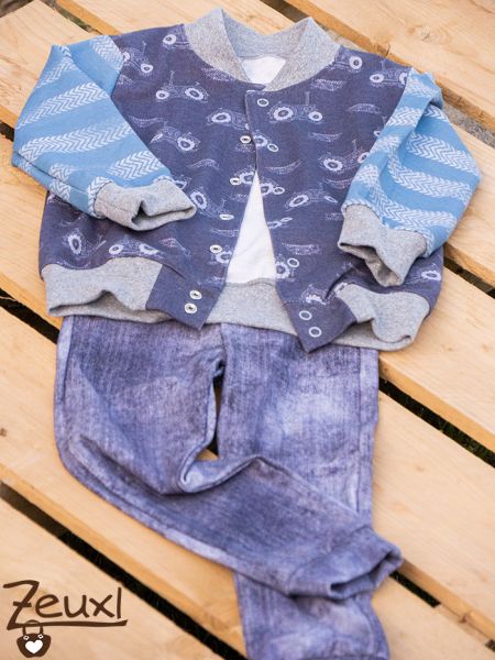 Der French Terry war von Hessekinner und war einmal ein Panel mit dem Traktor drauf und den Reifenspuren. Die kleinen Traktoren gab es als Kombistoff und passt einfach zu gut. Dieses Mal wurde es die Collegejacke von Klimperklein, die ich an unserem Buben so sehr liebe.