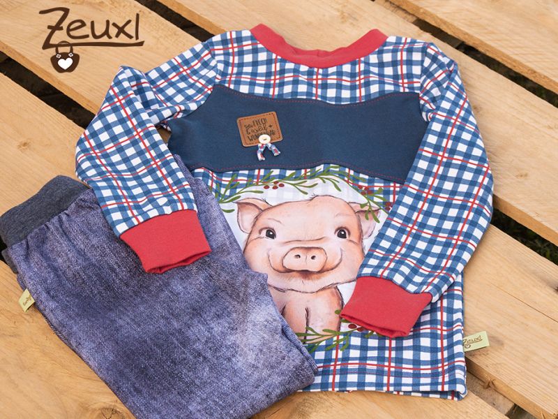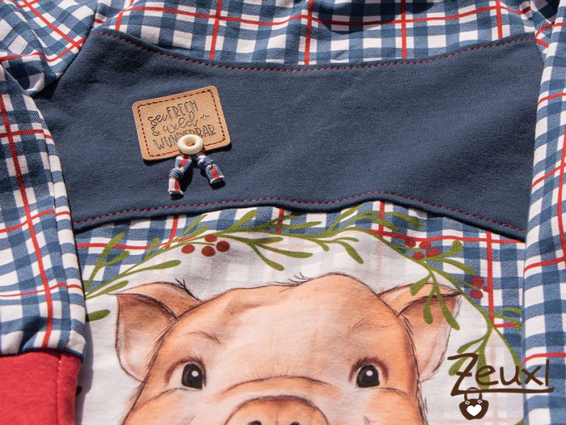 Es entstand ein Shirt mit Schweinchen drauf aus dem schönen Stoff von Mamasliebchen. Dafür verwendete ich das Mini Me Schnittmuster von Fusselfreies, das ich so, so gerne verwende. Kombiniert mit Dunkelblau und roten Bündchen. Auf das blaue Stück nähte ich dann noch ein Label (fertig gekauft, aber ich weiß nicht mehr woher) „Sei frech und wild und wunderbar“ – passend für den kleinen Mann, der das tragen wird.