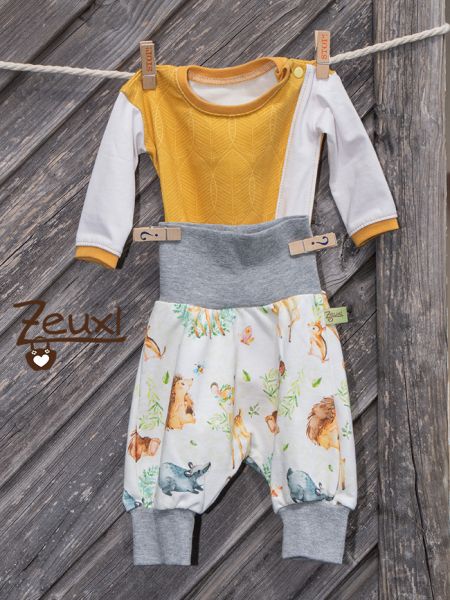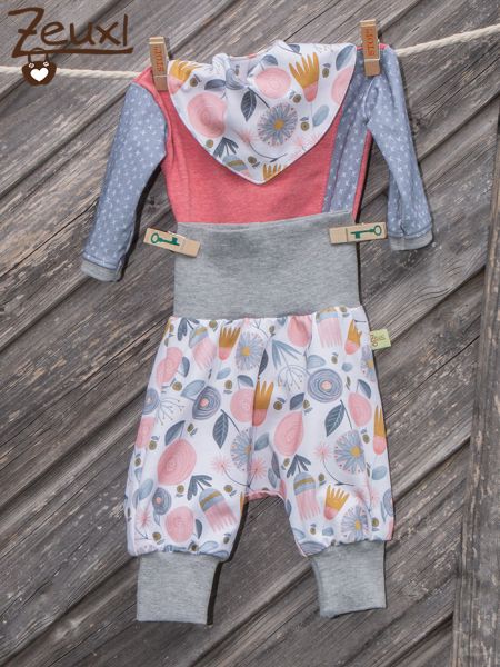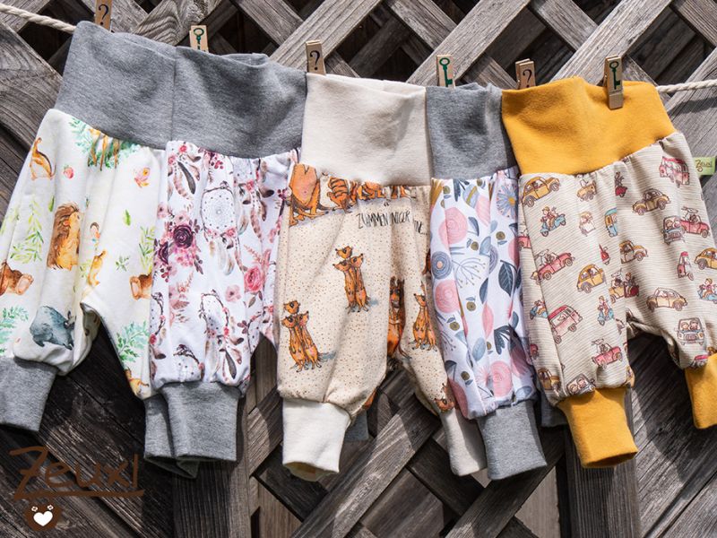 Ich blieb bei Größe 56, da die kleine Maus da gerade erst reinwächst. Auch verwendete ich wieder das Schnittmuster der Checkerhose von Klimperklein für die Hosen. Ich vermute, dass auch der eine oder andere Body vom ersten Geschenkeset zu diesen Hosen passen könnte.