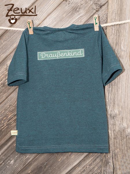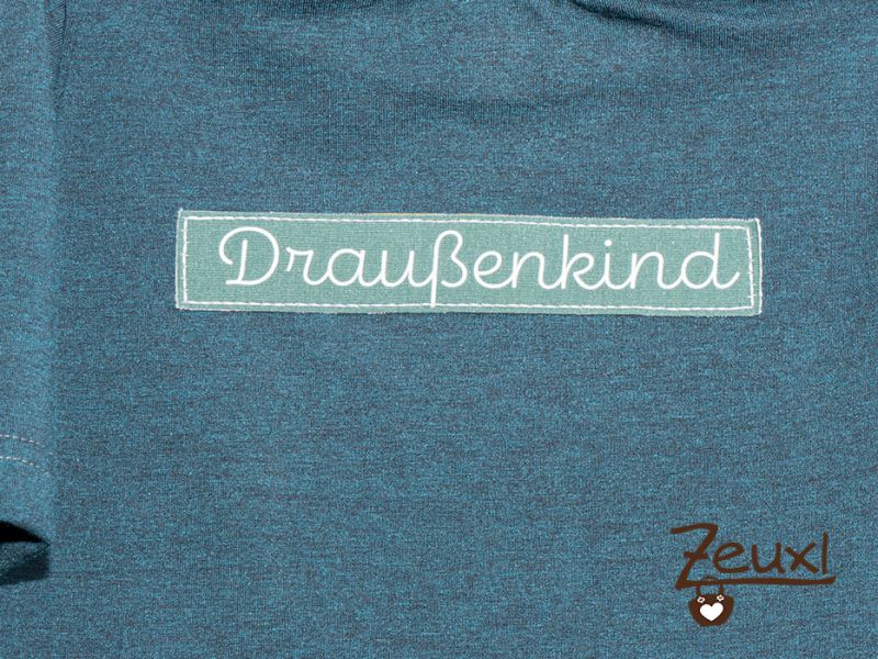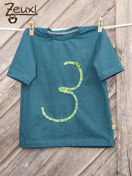 Es ist ein Basic Shirt von Klimperklein geworden. Ich verwendete einen grünmelierten Jersey und die Geburtstagszahl ist eine Stricklieselwurst – mit der Strickliesel solche „Würste“ herzustellen ist das neue Hobby unseres Buben – die ich aufgenäht habe.