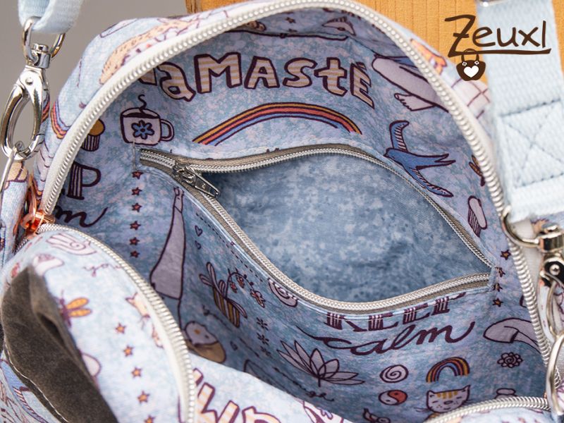Verschlossen wird Lilja mit einem Reißverschluss, so kann sie schön weit geöffnet werden, was ich immer ganz praktisch finde. Innen befindet sich dann noch ein Reißverschlussfach. Dafür verwendete ich einen Stoff, der wunderbar zum Yogastoff passt. Man könnte fast meinen, es sei tatsächlich der Yogastoff nur eben ohne die Motive. Hach, ich liebe es, wenn alles so schön harmoniert.