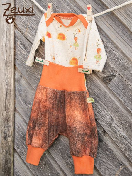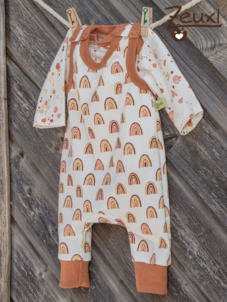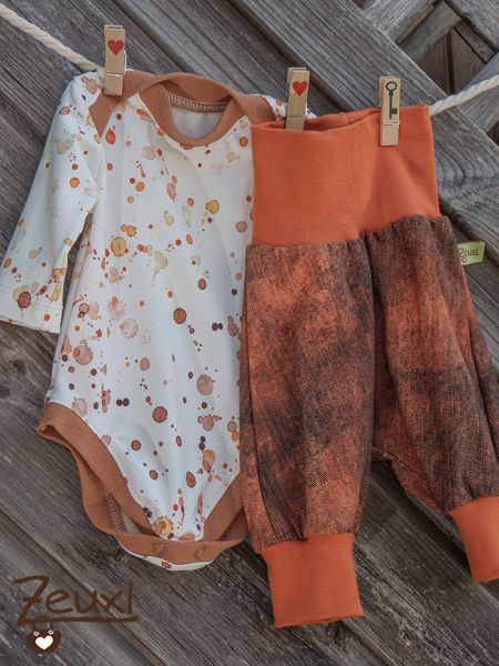 Zu dieser Hose würde auch der Body mit den Farbkleksen gut dazu passen. Auch wenn ich diesen eigentlich zum Strampler gedacht hatte. Als Schnittmuster wählte ich den Strampler ohne Fuß - auch von Klimperklein. Mit den schönen Regenbögen in Brauntönen harmoniert dieser Stoff wunderbar mit den Farbkleksen.