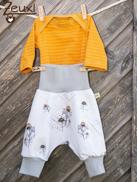 Als Hosenschnitt verwendete ich die Checkerhose von Klimperklein. Die ist schön pumpig, die Kleinen sehen darin so goldig aus und sind nicht eingeengt. Dafür verwendete ich einmal den French Terry von Makeart Berlin. Der hat schöne Gänseblümchen drauf und ist eigentlich ein Kombistoff zu den Hühnern (hier), aus dem ich das Ostershirt unseres Buben und auch dem Bruder des Babys (hier) ein Shirt genäht hatte.