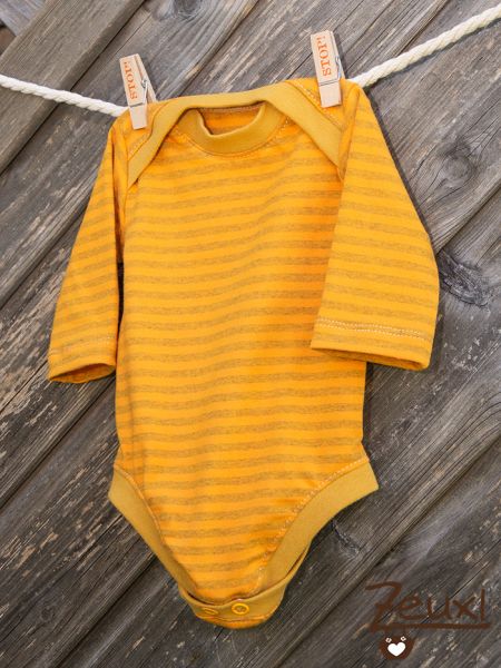 Dazu gibt es einen Body nach dem Regenbogenbodyschnitt von Schnabelina, Gelb und Ocker gestreift. Jetzt, in der warmen Jahreszeit, ist das Baby damit schon fertig angezogen. Deswegen auch die langen Ärmel, die ganz jungen Babys können die Temperatur noch nicht so gut halten und daher würde ich in diesem Alter auch im Sommer keine nackte Ärmchen „anziehen“. Lieber Langarmbody und dafür nicht noch ein weiteres Oberteil drüber.