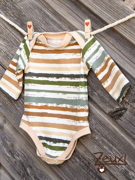 Ich nähte noch einen zweiten Strampler. Die braunen und grünen Herzen sind total süß und der Body mit den farblich passenden Streifen ist tatsächlich aus dem Kombistoff zu den Herzen entstanden.