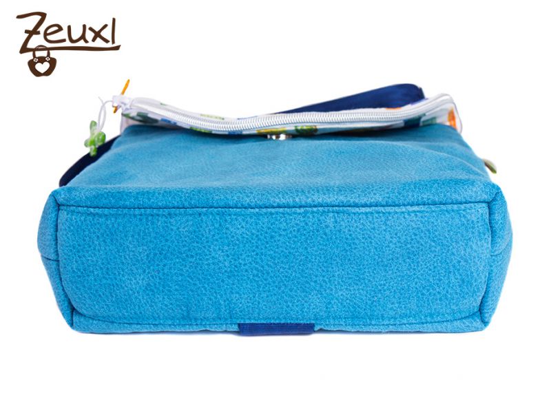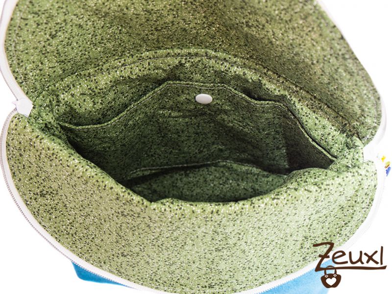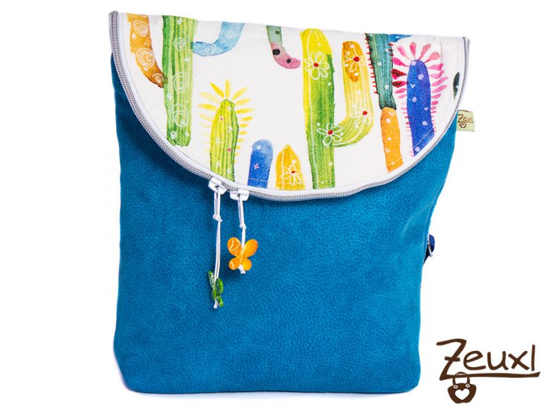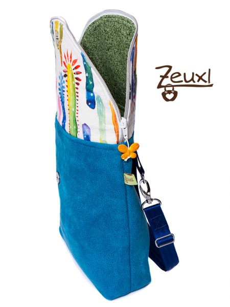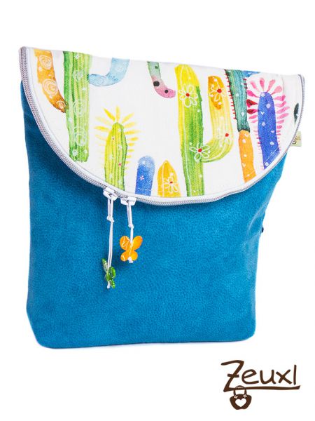 Die extrem sommerlichen Temperaturen der letzten Wochen haben mich dazu verleitet den Kakteenstoff anzuschneiden. Dazu kombinierte ich einen türkisfarbenen Polsterstoff. Ich entschied mich gegen den im E-book vorgesehenen, selbst genähten Tragriemen. Ich verwendete ein gekauftes Gurtband. Da ich das Gurtband in zwei Breiten da hatte, bot es sich an, den Trageriemen und auch den Steg auf der Rückseite der Tasche daraus zu machen. Dieser rückwärtige Steg ist das Highlight der Tasche, so kann Frau ihr Sommerjäckchen oder ihre Tücher bequem verstauen. Bei mir sind das keine Jäckchen ;-) aber ich bin auch eher der hitzige Typ und ohne Jacke unterwegs. Aber für den Buben nehme ich gerne eine Jacke oder Pulli mit. Auch dafür ist der Steg ideal.