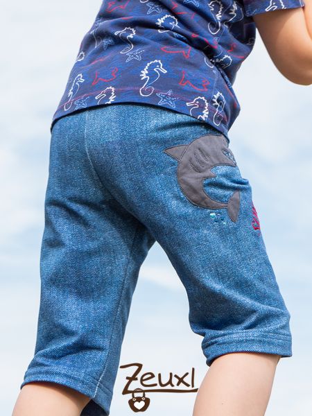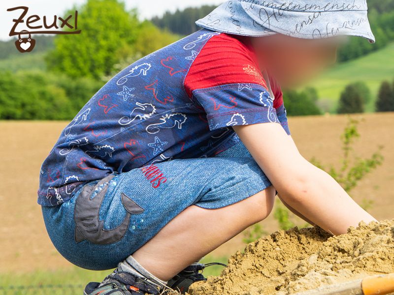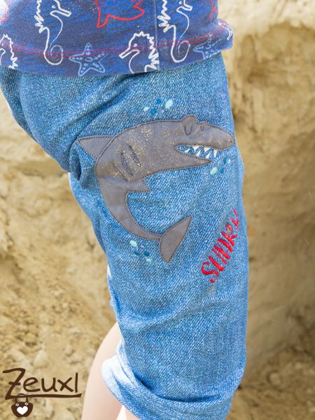 Für die maritime Komponente sorgt die neue Stickdatei mit Hai, die ich für Nadine von Fadenspiel – Stickdateien mit Herz probesticken durfte. Da ich den Hai seitlich auf der Hose platzieren wollte, entschied ich mich für die Kinderhose aus dem Klimperklein Buch Nähen mit Jersey Kinderleicht. Wenn sie ohne Fronttaschen genäht wird, kann sie im Bruch, also ohne Seitennaht, zugeschnitten werden und so konnte ich den Hai seitlich sticken.
