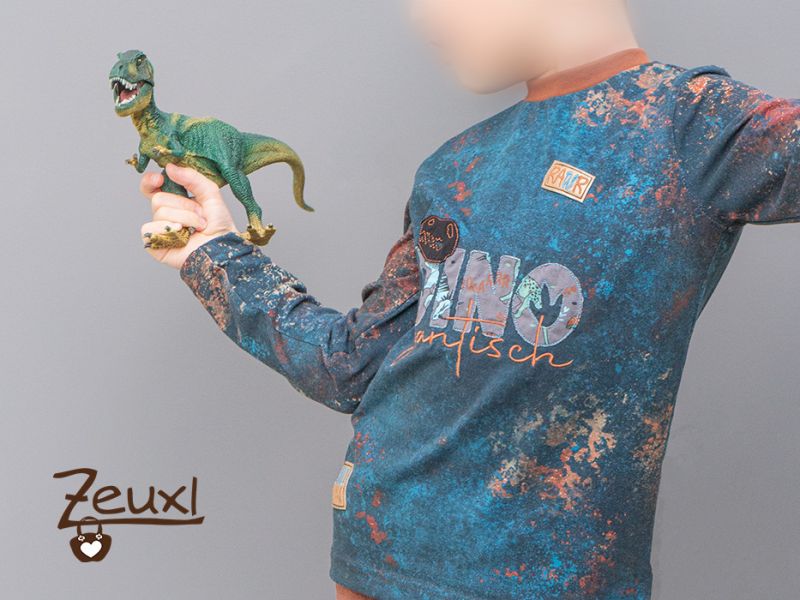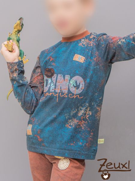 So begann die Suche nach einem Stoff, der zum Dino-Motivstoff passt. Nachdem ich einige Stoffe aus dem Schrank gezogen hatte, landete der Dinostoff eher versehentlich auf dem Reststück meines Shirts, das ich mir kürzlich genäht hatte. Diese Kombination fand ich ganz gut und blieb dabei.