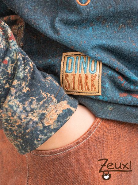 Schon beim grünen Dinopulli (hier) verwendete ich ein Label aus der Dino-Label-Stickdatei, die ebenfalls bei Fadenspiel erhältlich ist. Natürlich wollte ich auch hier Labels mit aufnähen. Diesmal auf goldenem Kunstleder gestickt.