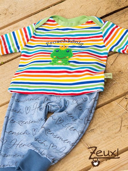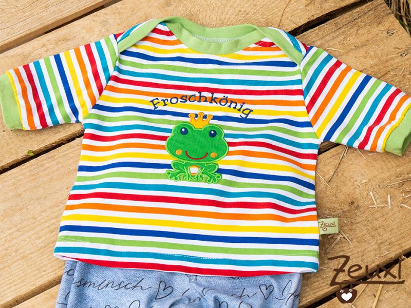 Das zweite Shirt, mit den bunten Streifen, bestickte ich mit dem kleinen Froschkönig aus einer Stickdatei von Lollipops for Breakfast. Manchmal darf es auch etwas farbenfroher sein, oder nicht?