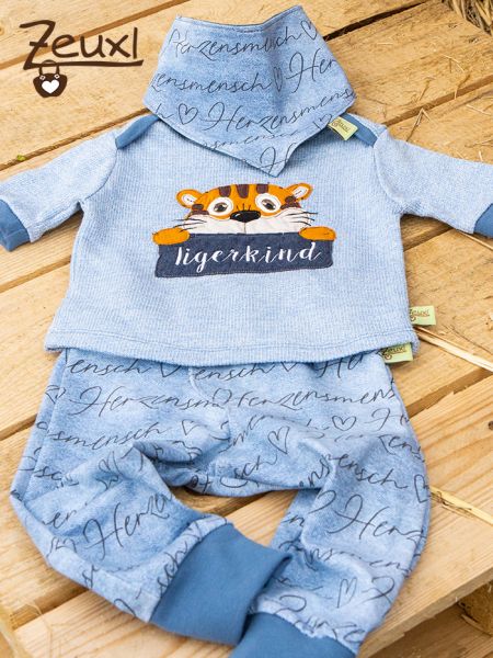 Bei diesem Stoff konnte ich (wie so oft) einfach nicht nein sagen. Natürlich bin ich nicht die Einzige, auch andere Mütter haben einen (oder mehrere) Herzensmenschen. Daher kam ich auf die Idee, aus diesem Stoff ein Set als Geburtstagsgeschenk für die Mutter eines kleinen Jungen zu nähen. Es entstand eine Babyhose von Klimperklein, passend dazu ein Halstuch und ich ergänzte das Set wieder (wie hier) mit Shirts von Fabrik der Träume.