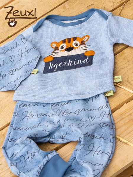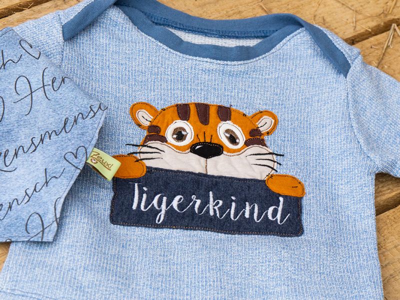 Der Shirt-Schnitt ist übrigens ein tolles Freebook. Um den schlichten, blauen Stoff noch etwas auf zu hübschen, bestickte ich das Shirt noch mit der Tigerkind-Stickdatei von Fadenspiel – Stickdateien mit Herz, die ich für die liebe Nadine probesticken durfte. Gerade für jüngere Kinder finde ich das süße Tigerkind so schön passend.