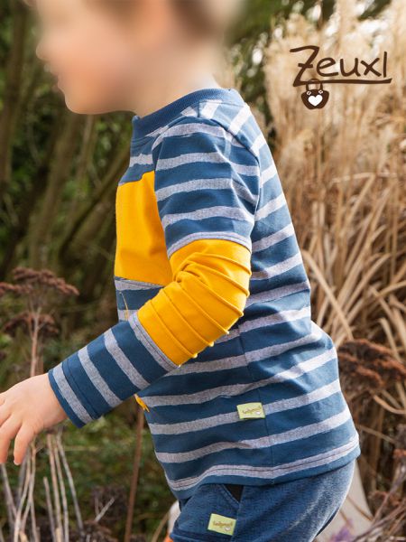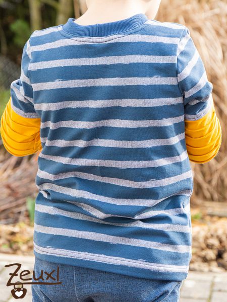 In meinen Stoffvorräten fand sich noch dieser Streifenjersey, den ich günstig als Reststück erstanden hatte. Ursprünglich dachte ich für eine Mütze mit Loop oder so. Aber durch die Teilungen hat mir der Stoff sogar noch für dieses Langarmshirt gereicht. Als Kontrast zu Blau und Grau wählte ich einen schönen senfgelben Jersey.