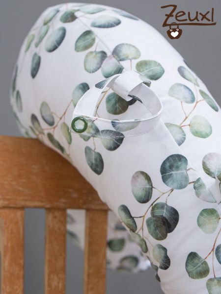 Im Schnittmuster sind drei Schlaufen vorgesehen, an die Beschäftigungsspielzeug für Babys angebracht werden kann. Ich wählte die Methode, eine extra Schlaufe dafür zu verwenden. Wenn nichts am Kissen befestigt ist und dann auch keine Verschlüsse zu sehen sind, finde ich persönlich einfach schöner. Die leeren Schlaufen stören mich dagegen nicht.