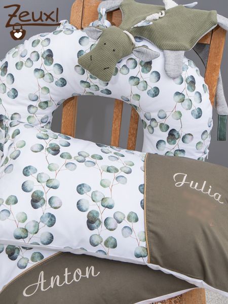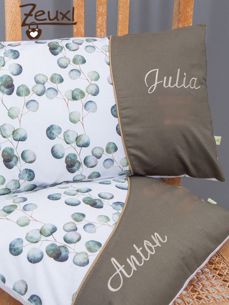 Farblich habe ich versucht mich am Stoff, den ich für die Kissen ausgesucht hatte, zu orientieren. Als ich den wunderschönen Stoff mit den Eukalyptusblättern bei Stick and Style entdeckte, wusste ich sofort, das ist der Stoff, den ich für dieses Geschenk will. Nicht nur die Optik hat mich überzeugt, auch die Haptik ist super. Nicht so dünn, sondern etwas fester.