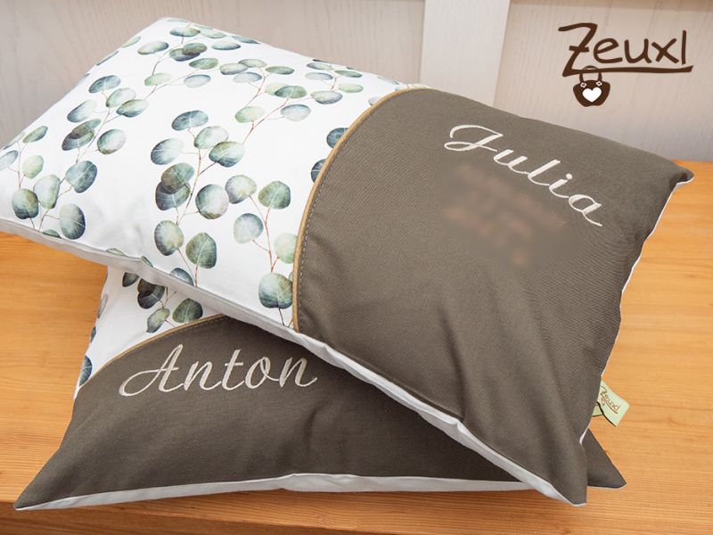 Dazu nähte ich noch zwei Kissen nach dem Fancy Kissenschnitt von Unikati. Diesen Schnitt mag ich wirklich sehr und habe schon hier und hier zum Beispiel Kissen nach diesem Schnitt genäht. Also für mich ein super Schnitt, den es in verschieden Größen gibt. Besonders schön finde ich die 30 x 50 cm Größe. In Kombination mit 40 x 40 cm ein schönes Duo. Ich kombinierte den Eukalyptusstoff mit unifarbenen Stoff und entschied mich noch eine beige Paspel einzunähen.