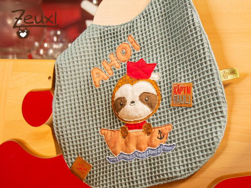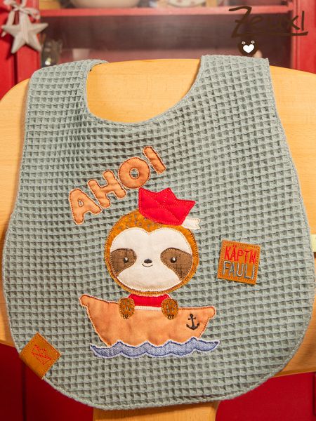 Da ich Lätze immer wieder gerne verschenke und Nachschub nötig ist, lag es nahe Käptn Fauli auf einen Latz zu sticken. Ich nähte den Latz doppellagig aus Waffelstoff nach eigenem Schnittmuster.