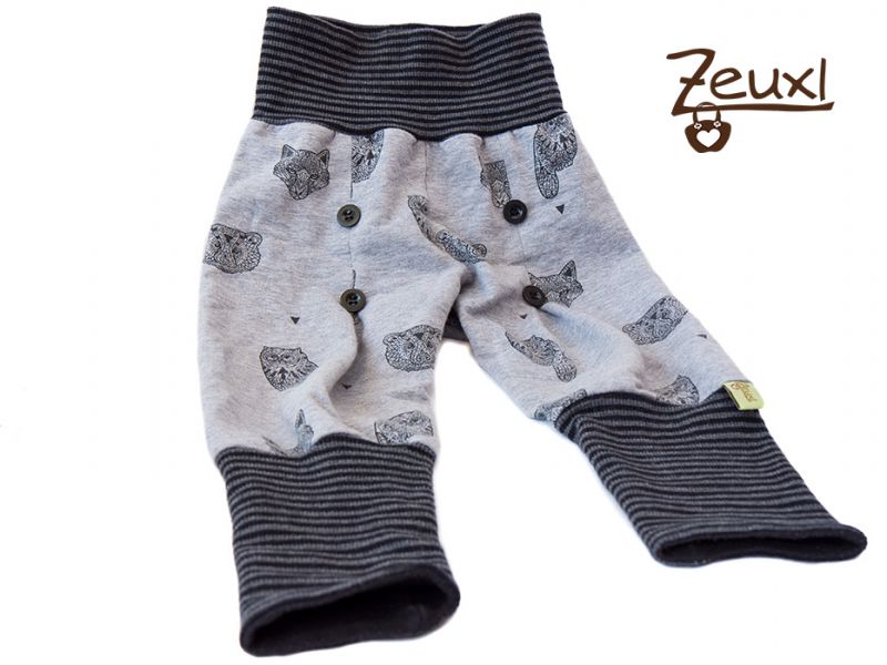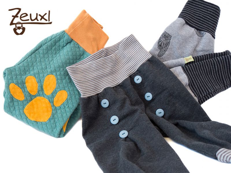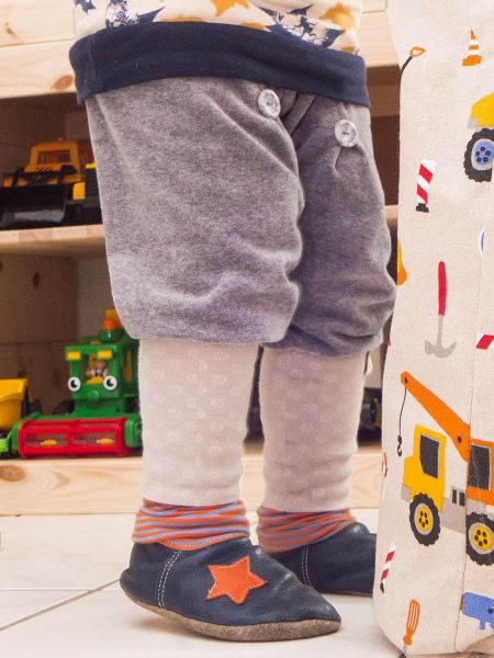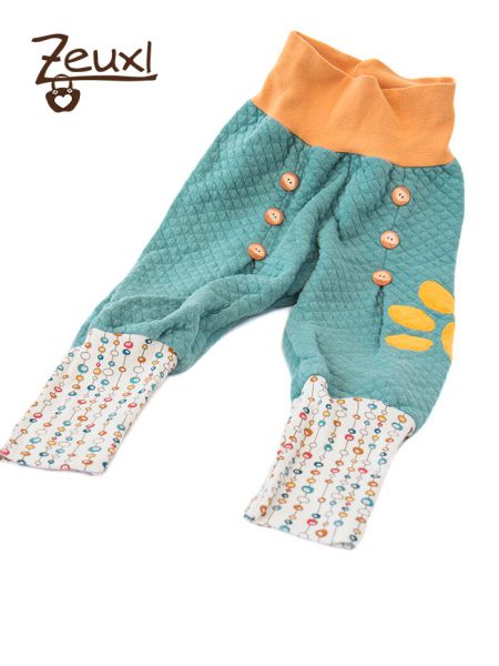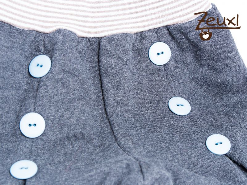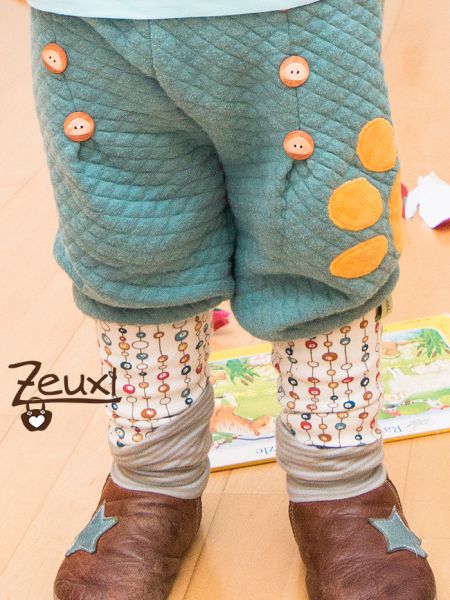 Inzwischen sind noch einige Hosen dazu gekommen. Durch die Kellerfalten vorne, die mit Knöpfen verziert werden, und die hohen Beinbündchen hebt sie sich von anderen Pumphosen ab. Sie ist echt schnell genäht – das Aufwendigste ist und bleibt das Annähen der Knöpfe. Inzwischen nähe ich die Hosen ohne normale Nähmaschine. Ich verwende den Kettstich meiner Cover/Overlock Maschine um die Falten zu nähen.