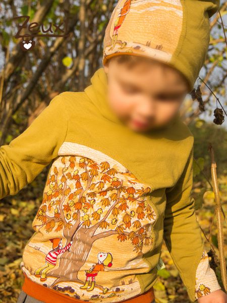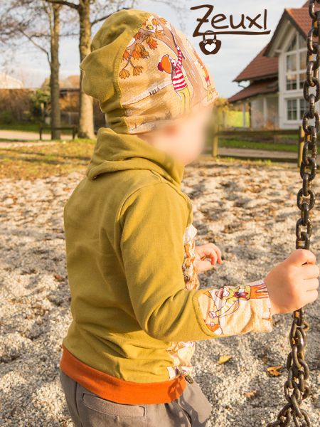 Zuerst konnte ich mich einfach nicht entscheiden was daraus werden sollte. Ich wollte nicht zu viel vom guten Stoff für diesen Herbst „opfern“, da dieser schon fast vorbei ist. Wer weiß, ob die aktuelle Kleidung nächstes Jahr noch getragen werden kann… Dann ist mir wieder eingefallen, dass ich mir das E-Book Henry von Lolletroll gekauft und bisher noch nicht ausprobiert hatte. Bei diesem Hoodie ist auch ein Kragen möglich und für die Teilungen kann man super Motivstoffe verwenden.