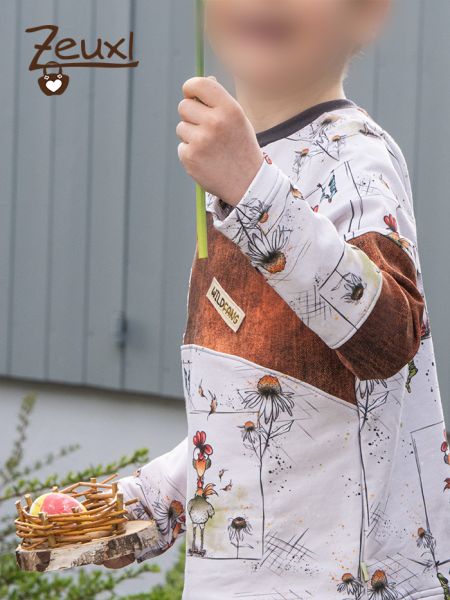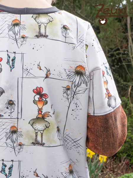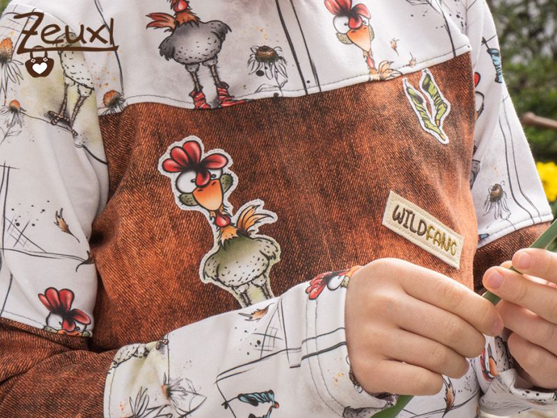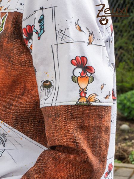 Dank der farbenfrohen Hühner hätten gleich mehrere Farben als Kombistoff gut gepasst. Aber den rostbraunen Look like Jeans French Terry, den ich noch als Reststück im Vorrat hatte, finde ich persönlich besonders schön und der Bub ist mit meiner Wahl einverstanden.