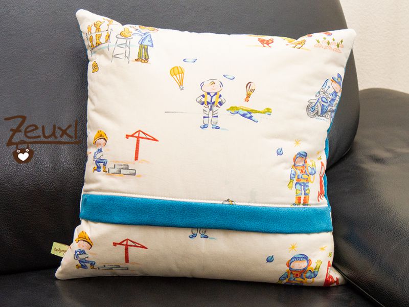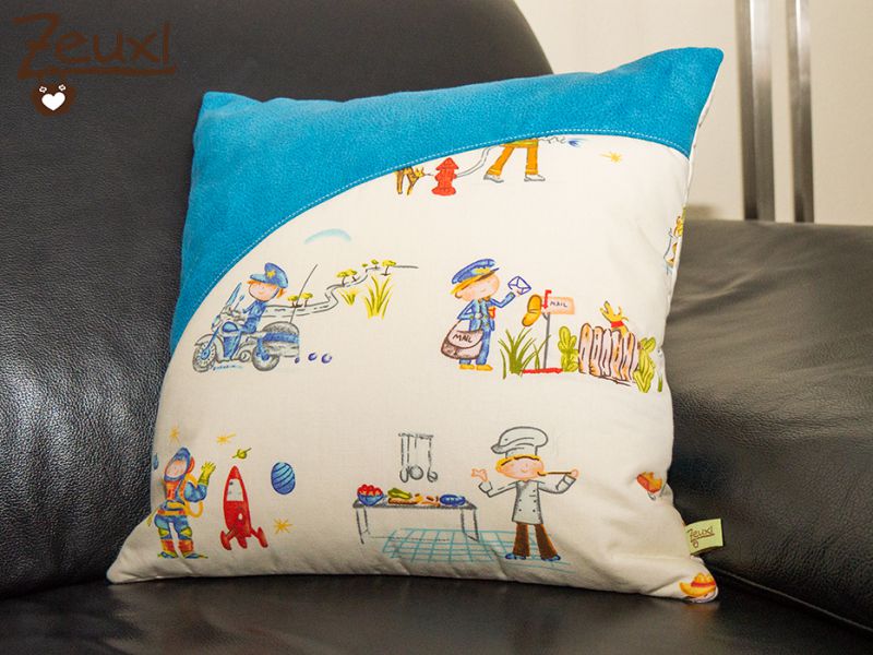 Für mein erstes Kissen schnitt ich endlich mal den Baumwollstoff mit den verschiedenen Berufen an. Schon lange gekauft – mal wieder ohne Plan wofür – wartete er auf seinen Einsatz. Kombinieren wollte ich den Stoff nicht noch zusätzlich mit anderen Mustern, deswegen entschied ich mich für den unifarbenen Möbelstoff. So ist ein Jungskissen entstanden, würde ich sagen, obwohl der Stoff eigentlich unisex ist. Aber als Gesamtes ist es für mich doch mehr jungslastig.
