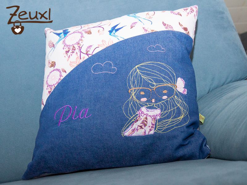 Das zweite Kissen derselben Größe ist eindeutig für ein Mädchen gemacht. Hier ist die Vorderseite aus Jeans, kombiniert mit diesem Musterstoff. Der Jeansstoff ist bestickt mit einem Mädchen (von RockQueen) und dem Namen des Mädchens, dem das Kissen demnächst gehören wird.