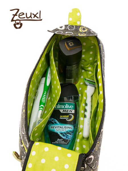 Den Kulturbeutel oder Wasch-Dasch (schwäbisch für Waschtasche) wollte ich Innen wie Außen aus beschichteter Baumwolle nähen. Da es mein Mann lieber etwas dezenter mag entschied ich mich für den schwarzen Stoff mit den Kringeln als Außenstoff. Trotzdem konnte ich es mir nicht verkneifen noch etwas mehr Farbe mit dem grün-weißen Innenstoff ins Spiel zu bringen. Zudem meine ich, es ist etwas übersichtlicher, wenn es in einer Tasche nicht zu dunkel ist.