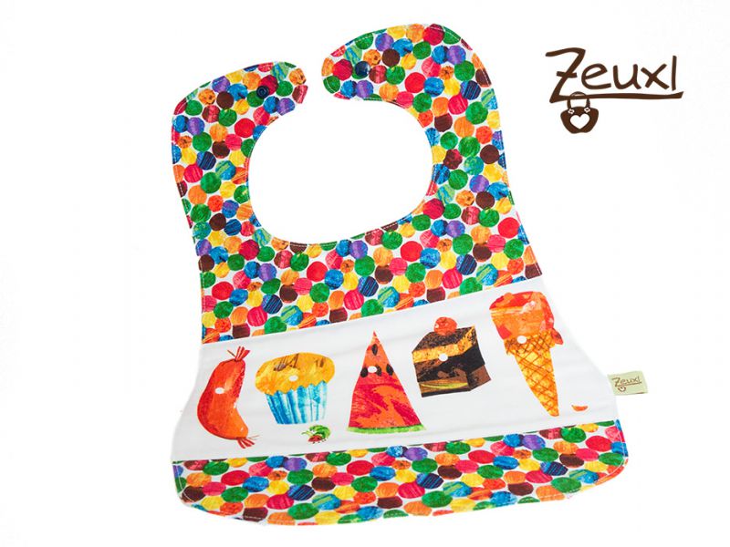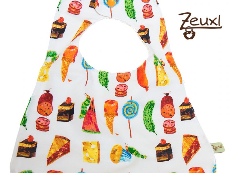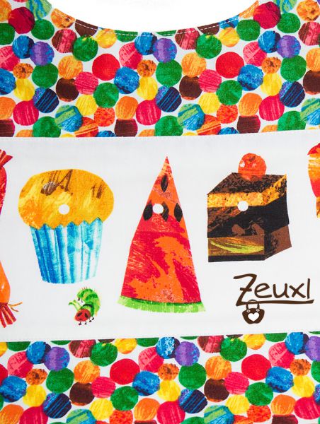 Was für ein Stoff bietet sich vor dieses Vorhaben besser an, als der schöne Raupe Nimmersatt-Stoff? Dieses schöne Kinderbilderbuch kennen wir doch alle, oder nicht? Passt wie Faust auf Auge! Ich habe davon vier Designs bestellt. Einmal ist die Raupe abgebildet, der zweite Stoff ist der mit der Raupe und den Lebensmitteln, beim dritten sind die bunten Punkten drauf und dann noch einen auf dem die Lebensmittel in Bordüren zu sehen sind. Weil´s mit besser gefiel, habe ich eine dieser Bordüren mit dem bunte Punkte Soff gemixt.