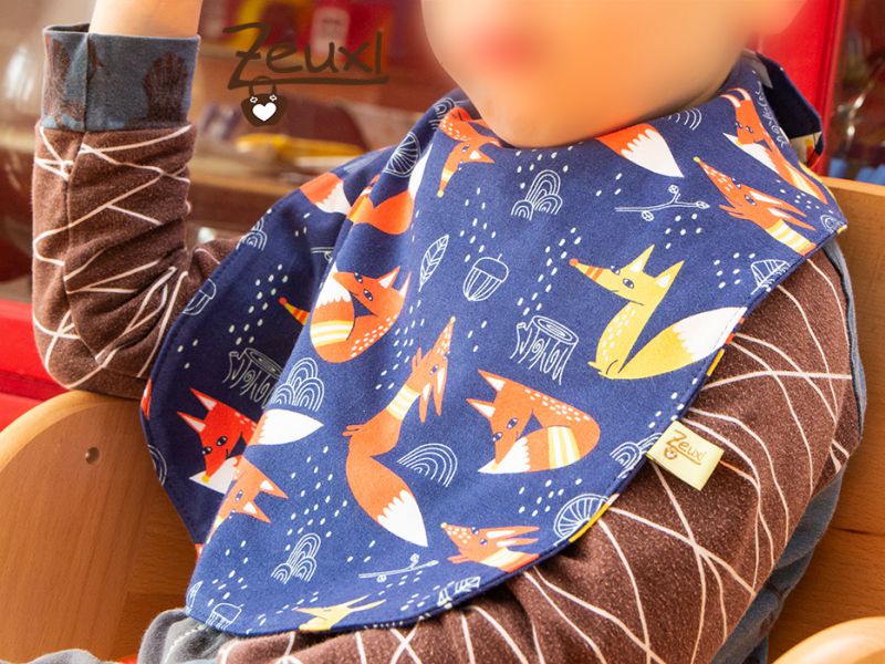 Für den ersten Latz verwendete ich für beide Seiten diesen Füchsejersey. So wird der Latz nicht ganz so dick, ist natürlich dadurch auch leichter und für die wärmere Jahreszeit gut geeignet. Bei diesem Jersey handelt es sich allerdings nicht um ein Reststück, das ich verwertet hatte, sondern ganz im Gegenteil. Der Stoff mit den Füchsen lagert schon eine ganze Weile bei mir. Das Problem ist nicht, dass er mir nicht mehr gefallen würde. Vielmehr hält mich die Kombifrage davon ab, das schöne Stück zu vernähen. Ein ganzes Shirt finde ich in diesem Design too much und irgendwie ist mir bisher noch kein passender, unifarbener Jersey untergekommen. Aber was noch nicht ist kann ja noch werden, oder?