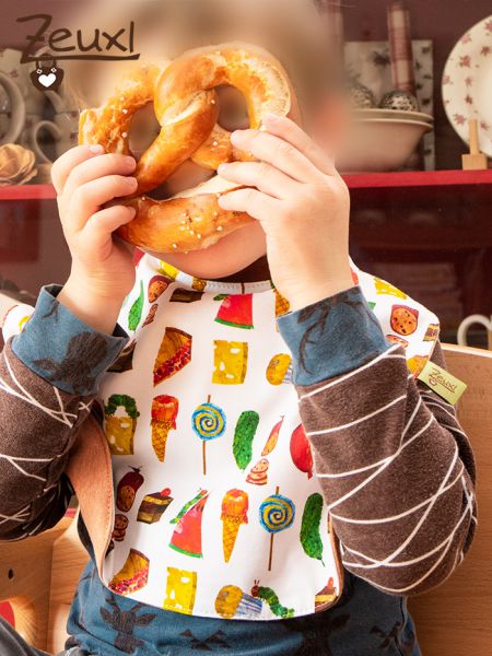 Der zweite Latz besteht aus einer Kombination von Jersey und Sweat. Den Nimmersattstoff verwendete ich bereits für dieses Shirt hier. Für einen Latz bietet er sich natürlich super an - mit all den leckeren Sachen drauf. Schon aus Webware hatte ich hier Lätze im Nimmersattdesign genäht und verschenkt. Was ich am Schnitt FINLEY besonders gut finde, ist das Bündchen für einen guten Sitz am Hals. Die Lätze gehen ganz fix zu nähen und bei Interesse ist das Freebook ist bei Miss Granny´s Hobbywerkstatt zu bekommen.