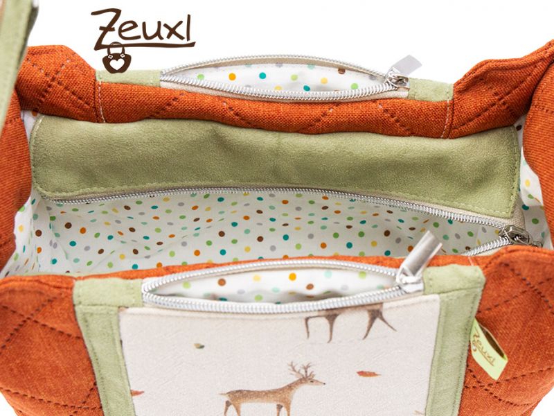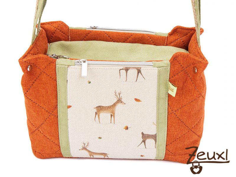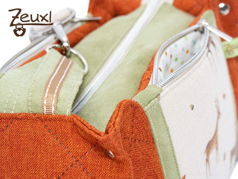 Die Rehe verwendete ich um die Mittelstücke vorne und hinten zu verschönern. Als besonders interessantes Detail befinden sich an den oberen Kanten der Mittelstücke je ein Reißverschluss. Das eine Fach, in dem mein Handy perfekt Platz findet, ist etwas tiefer und das andere Fach ist weniger tief und passend für Kleinigkeiten. Angrenzend an die Mittelstücke verlaufen die Kanten der Tasche schräg nach oben und geben ihr einen extravaganten Look.