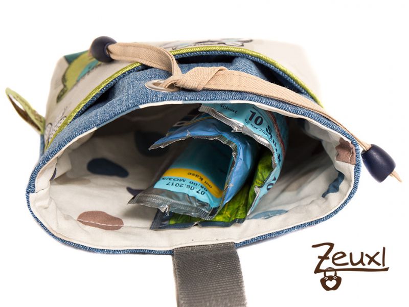 Die Stoffauswahl war diesmal ganz einfach. Vor kurzem verhalf ich einer abgetragenen Jeans zu einem neuen Leben als Kinderrucksack und ein Stoff mit Hund, Katze und Maus Motiven war der Kombistoff dazu. Wie passend auch für eine Hundeleckerli Tasche! Da mir die Kombination mit Jeans gut gefallen hat, wollte ich es noch einmal so machen. Die Bänder, die ich statt einer Kordel verwendete, hatten ebenso schon ein Vorleben. Die sind mal übrig geblieben, als ich eine Hose mit Bindebändern an den Beinen gekürzt habe. Als Futterstoff gepunktete, beschichtete Baumwolle und fertig.