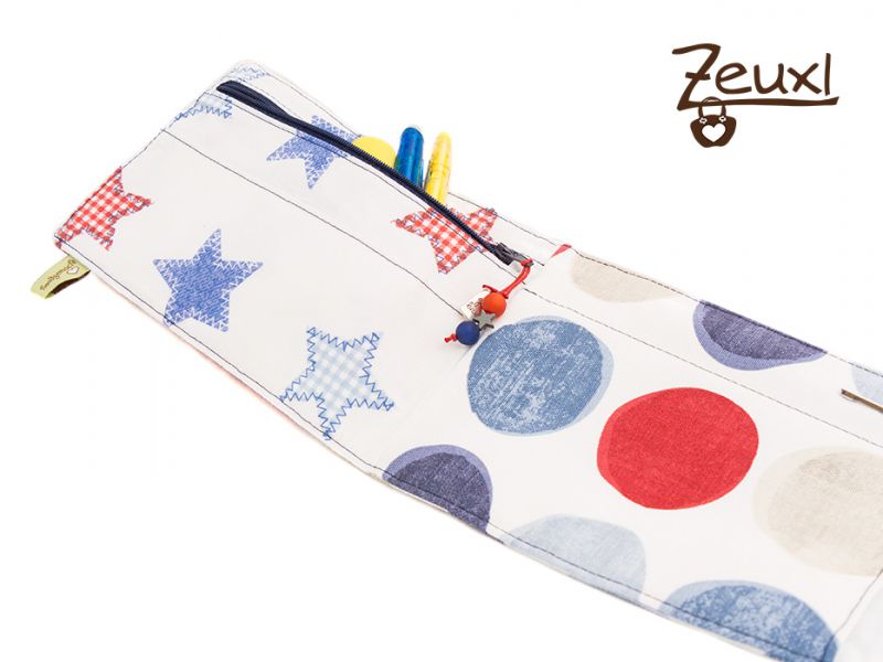 Da ich auf der einen Seite ein Geodreieck und einen Stift unterbringen wollte, musste auch diesmal meine Punkte Almut etwas breiter ausfallen. Auf der anderen Seite habe ich auf die vorgesehene Reißverschlussblende verzichtet. Dadurch kommt man ganz schnell an den Reißverschluss, um diesen zu öffnen. Darin können weitere Stifte und auch ein Klebestick verstaut werden. Aus den Kartenfächern wurde ein langes Fach für das sich sicher auch noch eine Verwendung findet. Beispielsweise könnten darin diese kleinen Klebefähnchen, um sich Seiten in einem Buch zu markieren, ihren Platz finden.