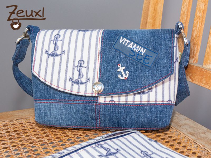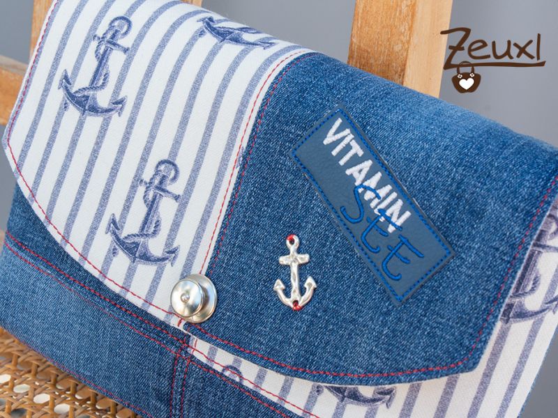 Zusätzlich verschönerte ich die Klappe, diesmal die runde Variante, mit einem kleinen Metallanker und einem Sticklabel, aus einer Datei von Fadenspiel – Stick- und Plotterdateien mit Herz. Ich mag es sehr wenn solche Kleinigkeiten eine Tasche noch zusätzlich aufwerten.
