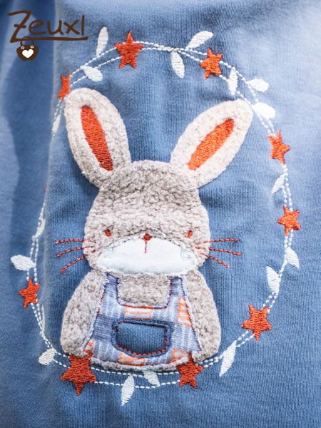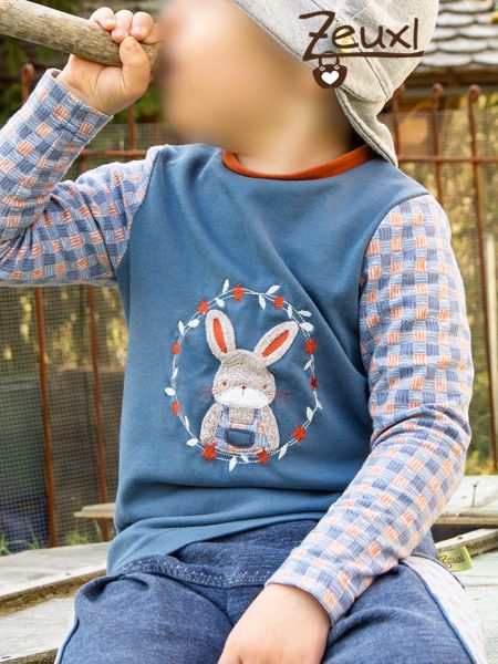 Gerade noch rechtzeitig zu Ostern ist dieses Hasenshirt entstanden. So konnten wir dieses Jahr doch tatsächlich eine Art „Osteroutfit“ vorzeigen. Der süße Hase im Rahmen passt aber auch gut zum Frühling allgemein. Und überhaupt, warum sollte man den kleinen Mümmelmann nicht das ganze Jahr über tragen?