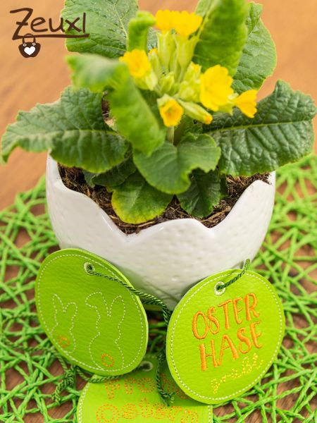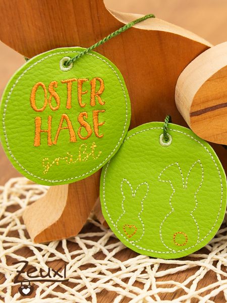Dazu sind noch drei runde Anhänger-Stickdateien enthalten. Diese könnten an die Säckchen dran gebunden werden, oder auch als hübsche Hänger, beispielsweise für den Osterstrauß, verwendet werden. Ebenfalls kann ich sie mir gut an einem Band um die Servietten am Ostertisch vorstellen.