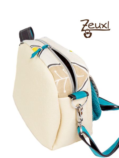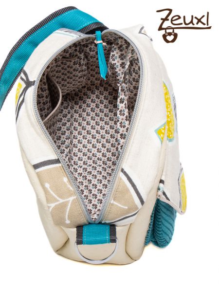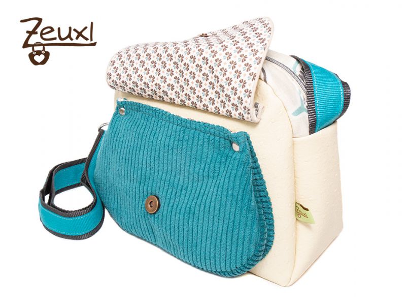 Kombiniert habe ich das Kunstleder mit Kord. Damit der Kontrast vom petrolfarbenen Breidkordstoff (der eigentlich eine Hose für den Buben werden sollte) zum Kunstleder nicht zu hart ist, versuchte ich den hellen Dekostoff mit den Blättern als eine Art „Vermittler“ zu verwenden. Ich verwendete ihn für die Klappe vorne und oben am Reißverschluss. Aus dem Kord nähte ich die aufgesetzte Plustertasche, die mit einem Druckknopf an der Klappe verschlossen wird. Erst dachte ich, ob ich diese Tasche vorne wohl viel nutzen würde? Nach mehrtägiger Verwendung der Alltagsheldin im Alltag kann ich sagen, ja, die ist prima für Taschentücher und/oder Sonnenbrillenetui geeignet.