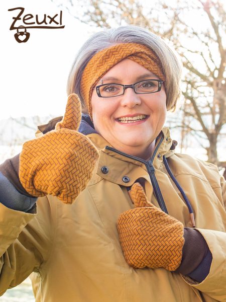 Als Futter wählte ich Jersey und das reicht aus um an durchschnittlich kalten Tagen warme Hände zu haben. Und weil noch ein Rest vom Außenstoff übrig war, entschied ich mich gleich noch ein passendes Stirnband dazu zu nähen. Dafür verwendete ich das Schnittmuster Aurelia von Himmelblau, das ich auch schon (hier) zu Weihnachten genäht und verschenkt hatte.
