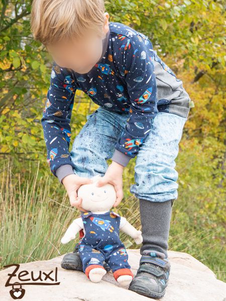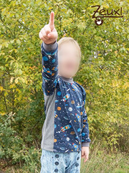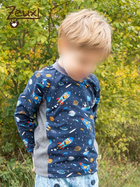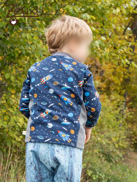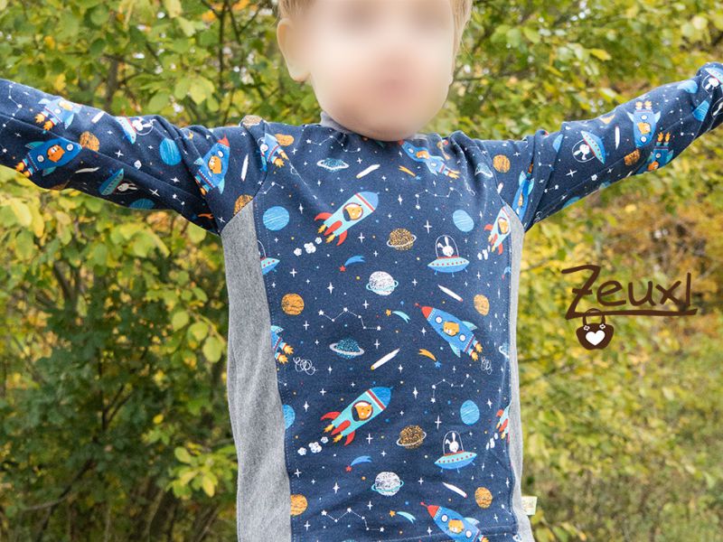 Ein toller Jerseystoff von Stoffonkel, also in Biloqualität, ist dann kürzlich bei mir eingetroffen. Das Weltraummotiv passt wunderbar zu unserm Buben. Noch immer ist er sehr interessiert an Weltraum, Planeten und „seinem“ Astronauten Alexander Gerst. Besonders gut finde ich dabei, dass unser Bub sich nicht ausschließlich für eine Sache begeistert, sondern zugleich Dinos, Bauernhof(maschinen) und nach wie vor das Thema Baustelle höchst spannend findet. So wird es auch für uns Eltern nicht langweilig ;-)
