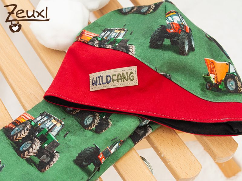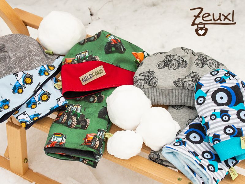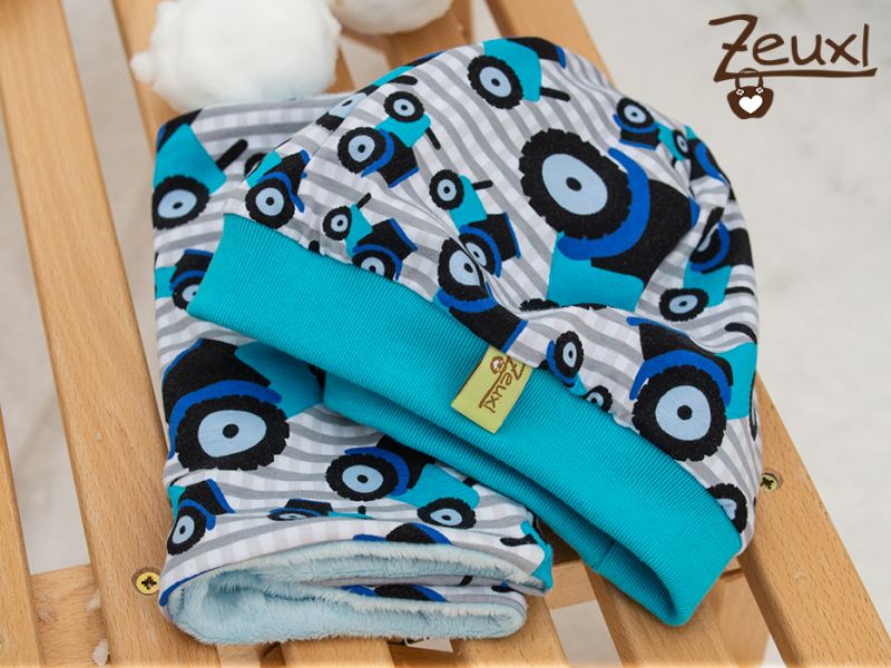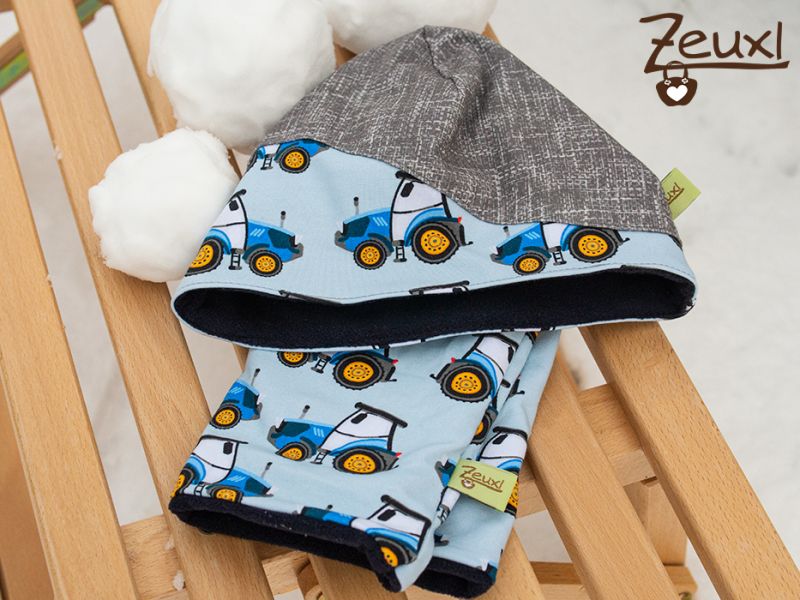 Deswegen konnte ich mich unmöglich für nur einen davon entscheiden und es entstanden gleich mehrere Loops plus die dazu passenden Mützen. So kann der kleine Traktorfan die Sets im Wechsel tragen und es gibt keinen Stress, falls mal was in der Wäsche ist.