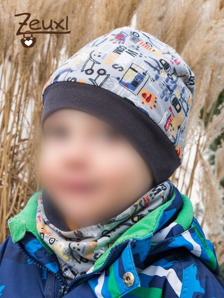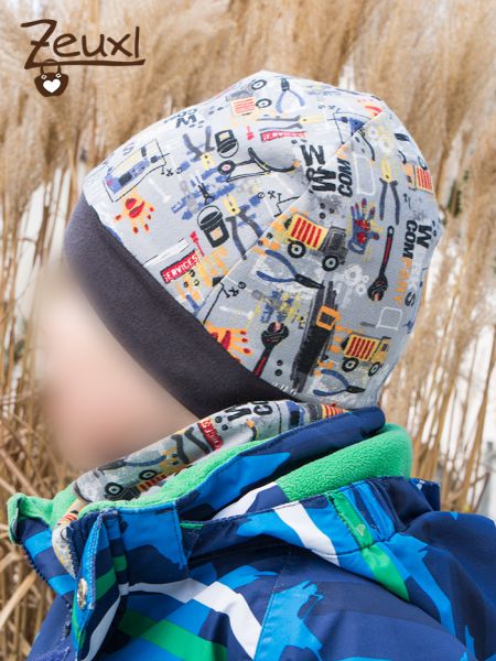 Ein toller Nebeneffekt ist dabei noch die Tatsache, dass für diesen Schnitt auch gut Stoffreste verwendet werden können. Aus diesem Werkzeugsweat ist bereits dieser Pulli endstanden und der Bub hat sich wirklich gefreut, dass er nun noch eine Mütze und Halssocke mit diesem Design besitzt.