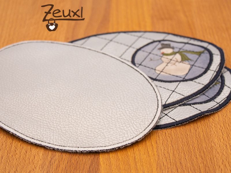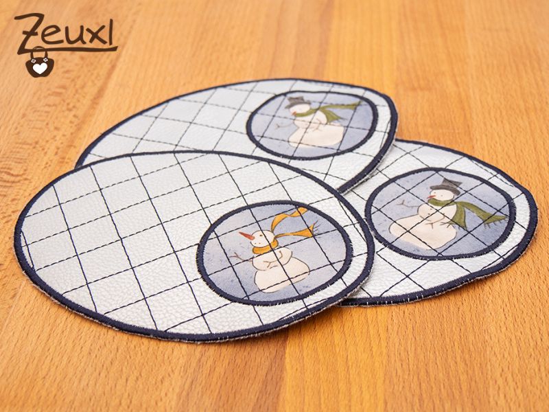 Als ich für Weihnachten den Stoff mit dem Strickprint als Rückseitenstoff für diese Mug Rugs verwendete, ist mir der Gedanke gekommen, daraus auch für mich welche zu nähen. Dabei wollte ich den Stoff nicht nur auf der Rückseite haben, sondern den Hirschkopf im Kreis auf die Vorderseite applizieren. Mit Hilfe der Stickeinheit meiner Nähmaschine hatte ich bereits hier schon einmal Kreise gestickt. Deswegen dachte ich, dies wäre nicht so schwierig.