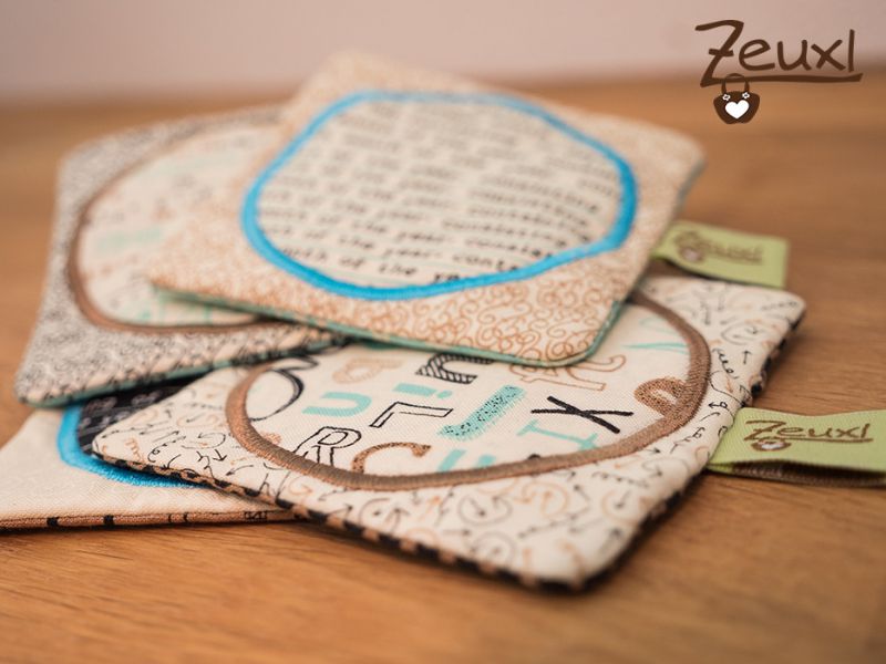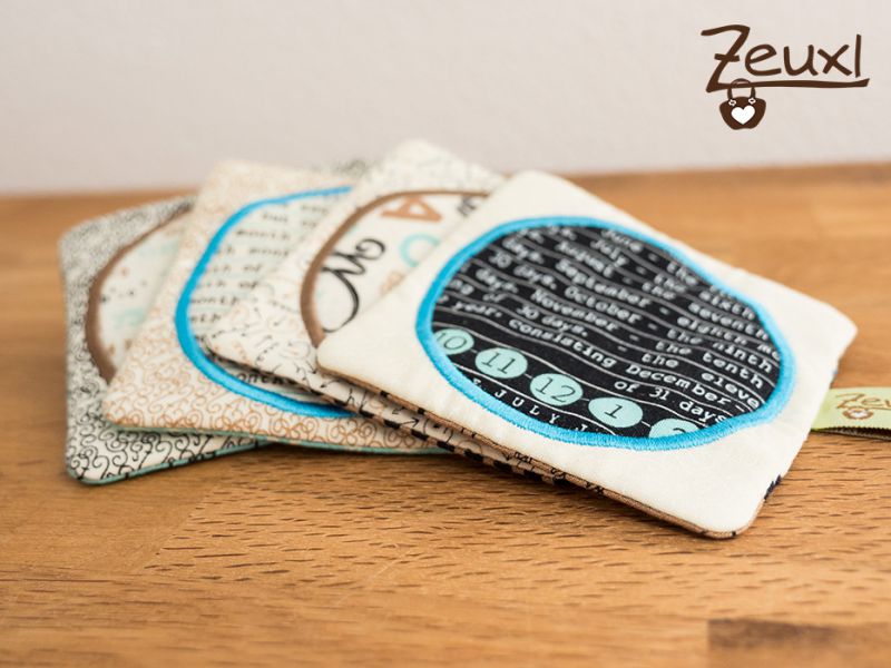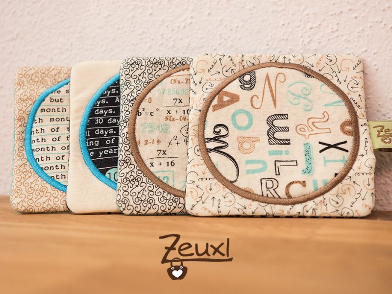 Ich entschied mich für eine Kombination aus Beige, Schwarz, Creme und Türkis. Wobei jeder Mug Rug ein Einzelstück ist, die vier aber ähnlich „aufgebaut“ sind. Für den Hintergrund wählte ich immer einen dezenten, kleingemusterten Stoff und für den Kreis einen auffälligeren. Für die Rückseite (leider vergessen zu fotografieren ;-) ) erhielten zwei einen beigen und die anderen beiden einen türkisfarbenen Stoff.