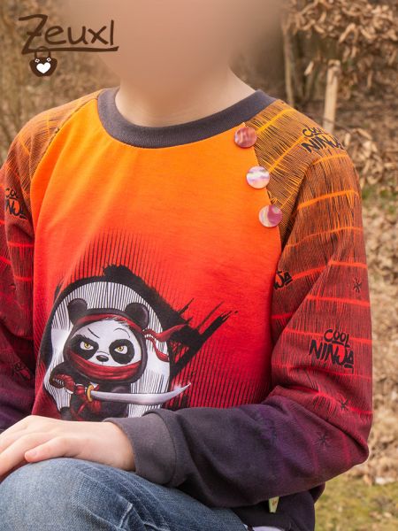 Unser Bub hatte sich genau diese Farben, es gab den Stoff auch noch in andern Farben (die mir eher zugesagt hätten), bei Fuchsfamilie ausgesucht. Aber gut, seine Entscheidung. Den passenden Kombistoff zum Cool Ninja bestellte ich auch dazu und wollte ihn für die Ärmel verwenden. Ich fand den Modest von PiexSu, den ich eh schon in der aktuellen Größe (hier) vorbereitet hatte, dafür super passend. Da ist dann auch wegen der Raglanärmel an den Schultern noch schön der Kombistoff zu sehen.
