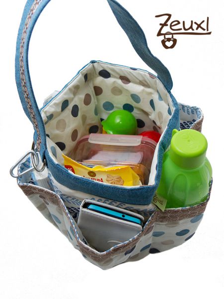 Schon beim Nähen bemerkte ich, dass das Utensilo alles andere als klein ist und meine Sandförmchen quasi darin verschwinden. Wenn meine Freundin damit tatsächlich zum Spielplatz geht passt jedenfalls ordentlich was rein. In den sechs Außentaschen könnten Getränk, Handy, Taschentücher, Sonnencreme usw. untergebracht werden.