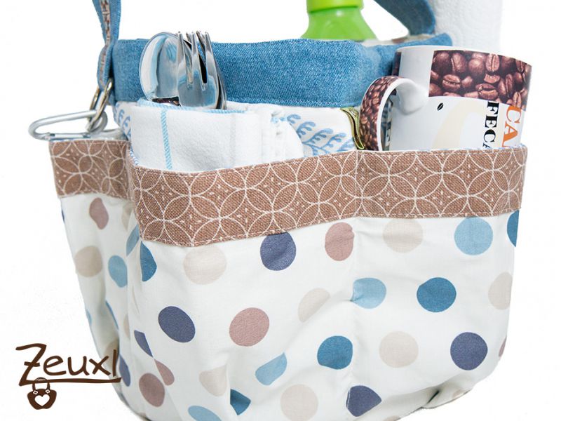 Bis auf den Henkel und die Dekobänder an den Rändern ist der Outdoorkorb aus beschichteter Baumwolle genäht. So kann er gut feucht abgewischt oder auch mal auf feuchtem Untergrund abgestellt werden.