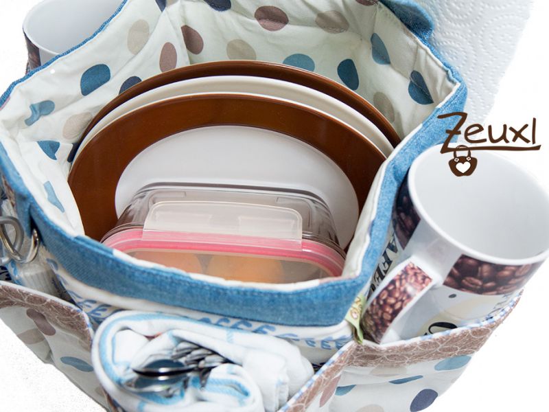 Weil das Ding doch etwas größer ist, probierte ich, ob auch Kuchenteller reinpassen. Also meine passen genau in den Korb. So kann meine Freundin ebenso Teller, Tassen, Besteck und Servietten von ihrer Wohnung in den Garten tragen und hat trotzdem noch eine freie Hand – was ja mit einem Kleinkind von Vorteil ist. Dann muss nur noch jemand gefunden werden, der den Kaffee trägt…
