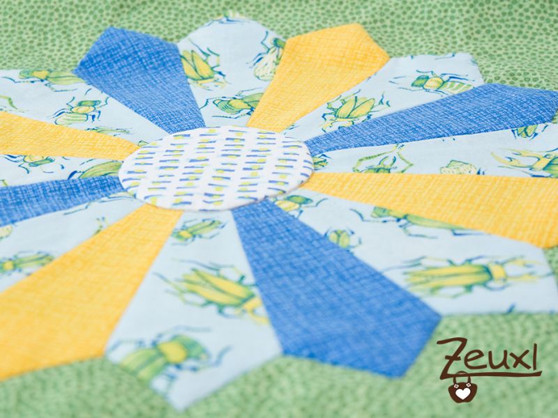 Letztendlich bekam mein Block den grünen Stoff als Hintergrund. Es gibt je vier gelbe und blaue Blades und acht Blades mit Käfern. Der Stoff des Mittelkreises geht schon fast zur Neige, da muss ich auf jeden Fall nochmal in den Stoffladen, vielleicht gibt es den noch…