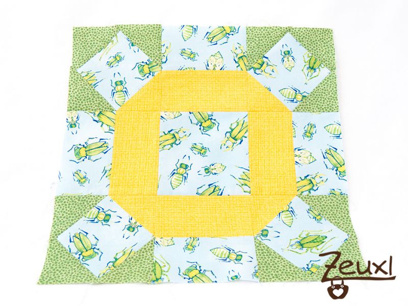 Beim Februarblock nennt sich das Muster Churn Dash. Dabei soll das Muster den Stampfer in einem Butterfass darstellen. Diesmal wollte ich den Stampfer hervorheben (ich hoffe, dass ich die richtigen Elemente als Stampfer erkannt habe). Deswegen ist der Insektenstoff nur in der Mitte zu finden und mein Stampfer in einem kräftigen Blauton.